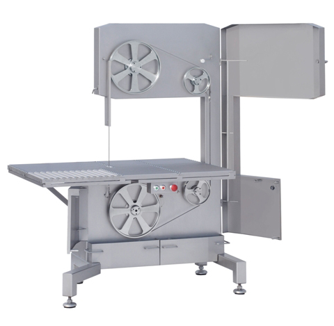 Standsäge mit Rollentisch komplett mit Portionierer, Knochenmehlbehälter, abnehmbarer Andrückvorrichtung, höhenverstellbarem Bandschutz und Motorbremse.
